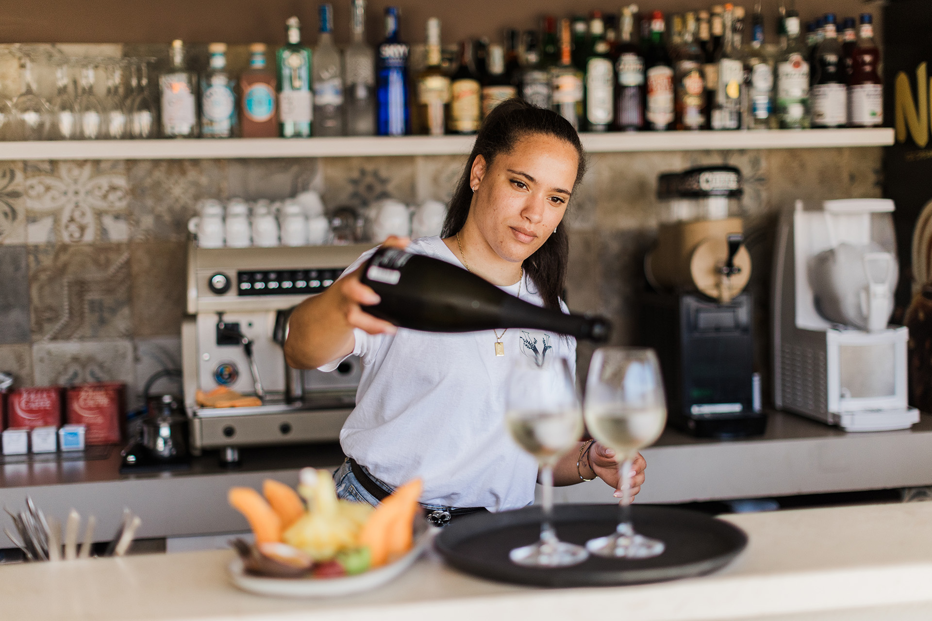 Cocktail, vini locali e stuzzicherie da gustare con il tramonto che si riflette sulla baia.
